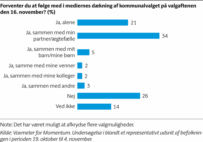 Undersøgelsen viser også, at 6 ud af 10, at de forventer at følge mediernes dækning på valgaftenen, men også at der er 21 procent, der forventer at gøre det alene.