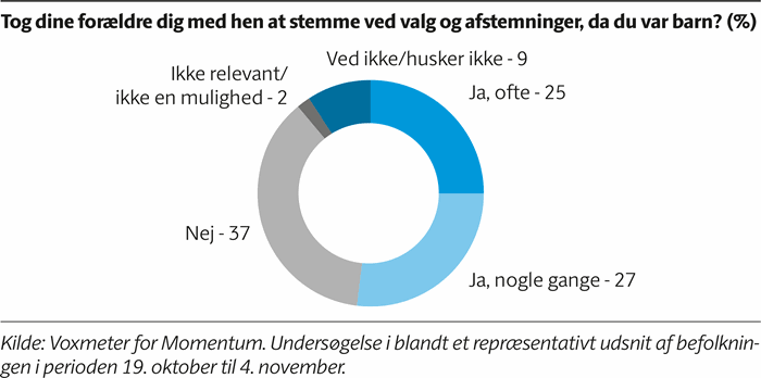 I undersøgelsen svarer 25 procent, at deres forældre ofte tog dem med hen at stemme, da de var børn, og 27 procent, at det skete nogle gange. 37 procent svarer, at forældrene ikke tog dem med. Selvom valgdeltagelsen dykker blandt befolkningen i 20’erne, så stiger den med alderen.