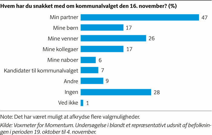Topscoreren er ens partner, som 47 har drøftet kommunalvalget med, mens 26 procent har talt med deres venner, og 17 procent har gjort det med henholdsvis deres børn eller kollegaer. Der er dog også 28 procent, der svarer, at de ikke har talt om valget med nogen.