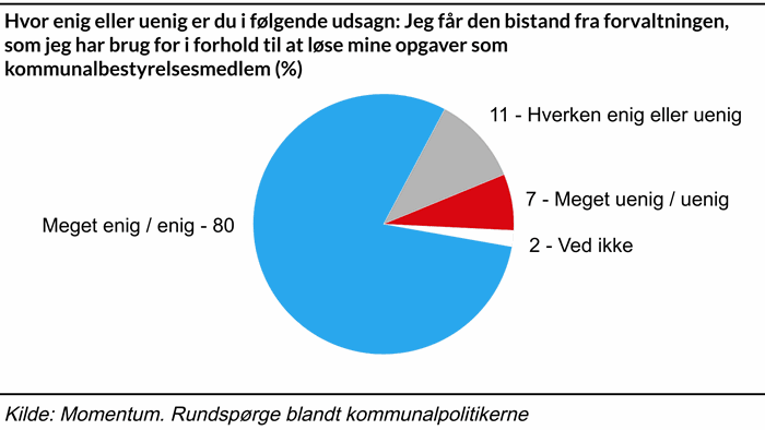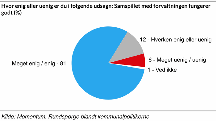 Udover at sætte spot på embedsmændenes dilemma i den politiske ageren, så viser undersøgelsen, at der generelt er meget stor tilfredshed med forvaltningens arbejde blandt kommunalpolitikerne. Hele 81 procent svarer således, at de er meget enige eller enige i, at samspillet med forvaltningen fungerer godt, og 80 procent føler, de får den bistand fra forvaltningen, som de har brug for i forhold til at løse deres opgaver som kommunalbestyrelsesmedlem.