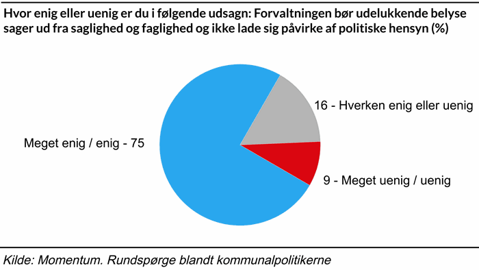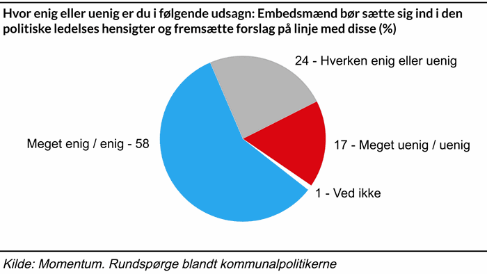 Her svarer 75 procent af kommunalpolitikerne, at forvaltningen udelukkende bør belyse sager ud fra saglighed og faglighed og ikke lade sig påvirke af politiske hensyn, mens 9 procent er uenige, og 16 procent hverken er enige eller uenige. Samtidig svarer 58 procent, at embedsmænd bør sætte sig ind i den politiske ledelses hensigter og fremsætte forslag på linje med disse, mens 17 procent er uenige, og 24 procent hverken er enige eller uenige.