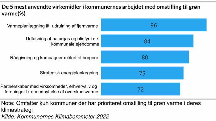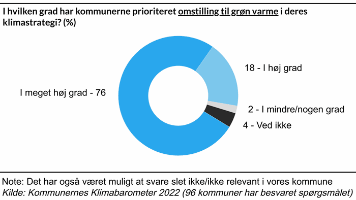 En ny undersøgelse viser, at kommunerne i den grad er i gang med at sætte tempo på omstillingen til grøn varme. Mere end ni ud af 10 kommuner prioriterer allerede enten i høj eller meget høj grad at få fossile energikilder som naturgas og oliefyr udskiftet med grøn og mere klimavenlig varme som led i deres klimastrategi. Det er først og fremmest arbejdet med at udrulle fjernvarme, rådgive og lave kampagner målrettet borgerne, indføre varmepumper og varmeenergifællesskaber, ligesom de arbejder med at få skrottet naturgas og oliefyr i de kommunale ejendomme, som kommunerne har fokus på.