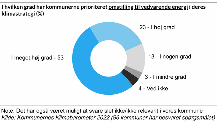 Klimabarometret viser da også, at sikring af forsyningen i form af vedvarende energi har høj prioritet i kommunerne. Mere end halvdelen af kommunerne har i meget høj grad prioriteret vedvarende energi i deres klimastrategi, og 27 procent har det i høj grad som prioritet.