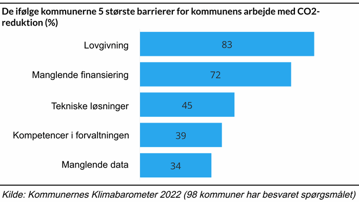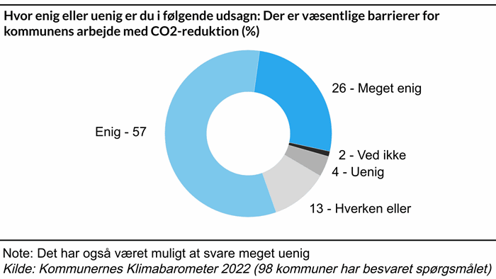 Kommunerne oplever dog stadig barrierer i arbejdet med CO2-reduktion. 83 procent af kommunerne er enige eller meget enige i, at der er væsentlige barrierer for kommunens arbejde med CO2-reduktion. Heraf peger mere end otte ud af 10 af de adspurgte kommuner på, at lovgivningen - især omkring solceller - skaber nogle forhindringer.