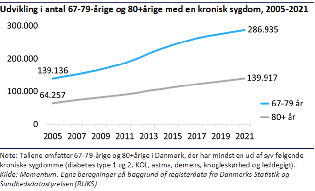 »Der bliver flere ældre med kroniske sygdomme, og der er forskel på deres ressourcer og netværk. Så vi er nødt til at tage udgangspunkt i det hele menneske og den enkeltes ønsker og behov. Derved er der også potentiale for undgå hospitalsindlæggelser,« mener hun og peger på, at der i Momentums analyse er kommet over dobbelt så mange kronisk syge ældre fra 2005 til 2021.