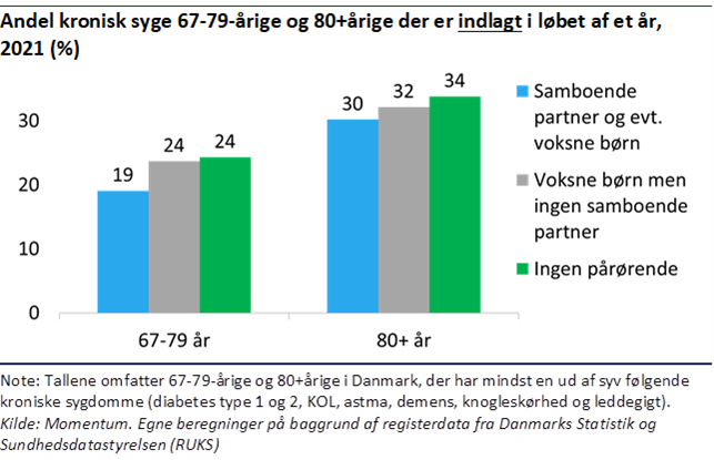 Og samtidig viser analysen, der omfatter ældre, som har astma, type 1- og 2-diabetes, KOL, leddegigt, osteoporose eller demens at det forholder sig modsat, når det gælder indlæggelser, hvor det er de enlige uden børn, der oftest er indlagt. Her har 34 procent været indlagt i løbet af året, mens det kun gælder 30 procent af de 80+årige, der bor sammen med en.