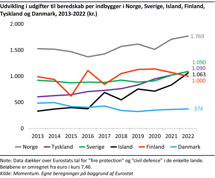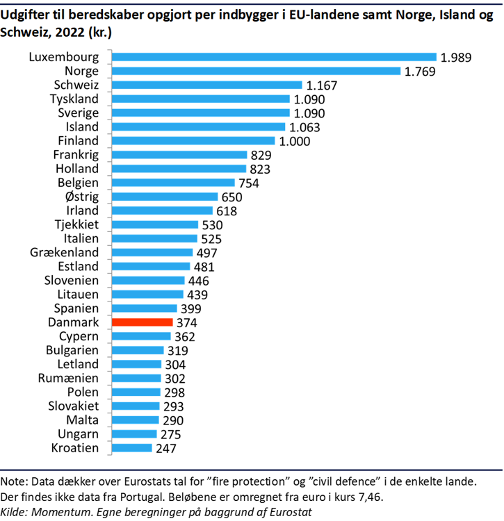 Kigger man på udgifterne pr. indbygger, så ser det lidt pænere ud for Danmark, der dog stadig indtager en plads omkring den nederste tredjedel. Danmark bruger nemlig blot 374 kroner pr. indbygger på beredskaberne. Til sammenligning bruger et land som Holland mere end det dobbelte, mens Norge, Sverige og Tyskland bruger omkring tre gange så mange penge.