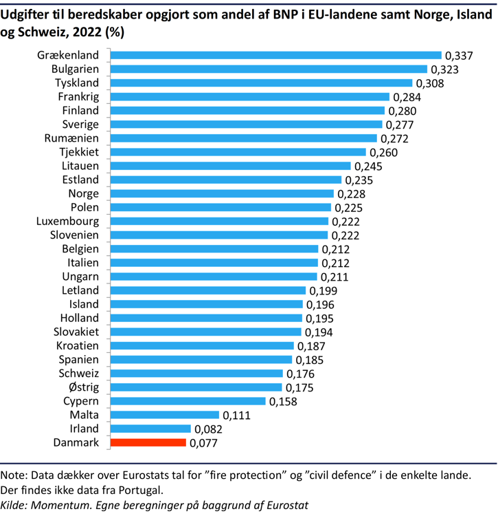 Danmark bruger nemlig blot 0,077 procent af BNP på beredskaberne, hvilket placerer Danmark helt i bund på den europæiske liste og langt efter nabolandene Sverige og Tyskland, hvor udgifterne udgør næsten fire gange så meget som i Danmark.