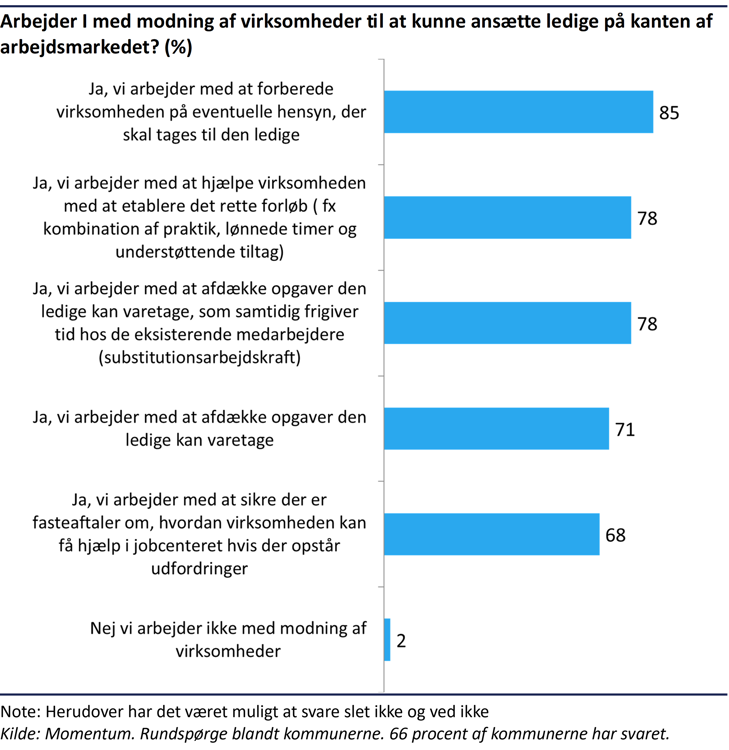 Og Hedensted Kommune er langt fra alene. I en rundspørge, som Momentum har foretaget blandt landets kommuner, svarer et stort flertal af kommunerne, at de også på flere måder arbejder med at understøtte virksomhederne, så de bliver bedre rustet til at tage imod de ledige. For eksempel arbejder 85 procent af kommunerne med at forberede virksomhederne på særlige hensyn, der skal tages til den ledige, 78 procent hjælper med at etablere det rette forløb og afdække, hvilke opgaver den ledige kan varetage, mens 68 procent af kommunerne arbejder med at sikre, at der er faste aftaler om, hvordan virksomheden kan få hjælp i jobcenteret, hvis der opstår udfordringer.