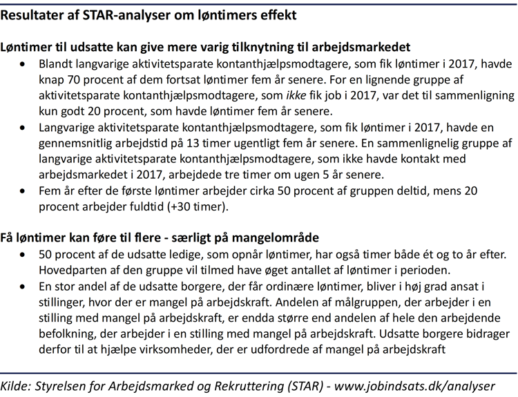 Og der er god grund til at have fokus på småjob. For en række analyser, som Styrelsen for Arbejdsmarked og Rekruttering har lavet, viser, at løntimer til udsatte ledige giver mere varig tilknytning til arbejdsmarkedet, kan afhjælpe mangel på arbejdskraft og har en langsigtet positiv effekt.