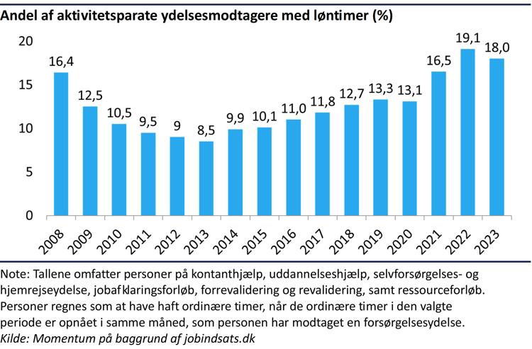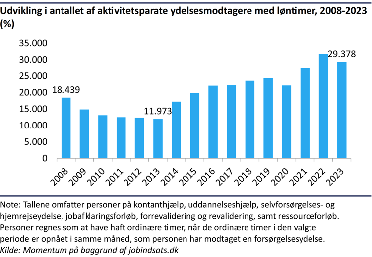I 2008 var det 18.439 af de aktivitetsparate ydelsesmodtagere, der havde lønnet arbejde som en del af beskæftigelsesindsatsen, mens det steg til 29.378 i 2023. En stigning på næsten 60 procent.
