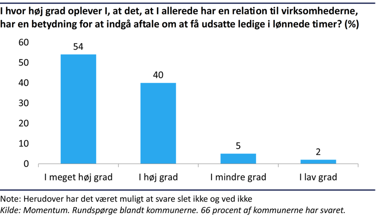 Momentums rundspørge viser da også, at jobcentrenes tætte kontakt med virksomhederne er afgørende. Således mener 94 procent af kommunerne, at det, at de allerede har relationer til virksomhederne, har betydning for, at de kan indgå aftaler om at få udsatte ledige i lønnede timer.
