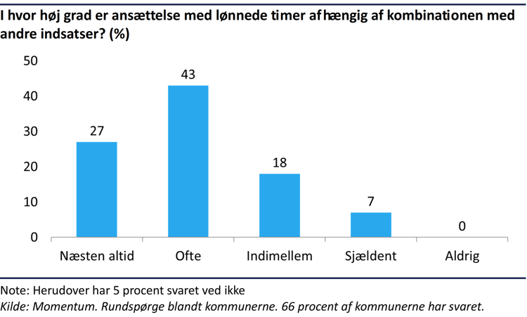 Momentums rundspørge understeger også, at mange af de aktivitetsparate ledige ofte har brug for yderligere hjælp end blot at finde en arbejdsplads. Hele syv ud af ti kommuner oplever, at succesen med at få personen i lønnede timer er afhængig af, at det sker i kombination med andre indsatser.