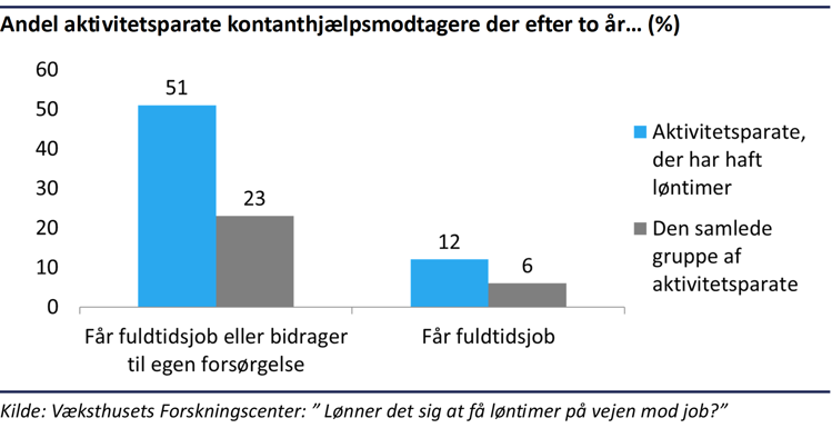 Senest har Væksthusets Forskningscenter i samarbejde med professor i økonomi ved Aarhus Universitet, Michael Rosholm, fundet frem til, at de aktivitetsparate kontanthjælpsmodtagere, der har haft lønnede timer, klarer sig væsentligt bedre end andre aktivitetsparate kontanthjælpsmodtagere.