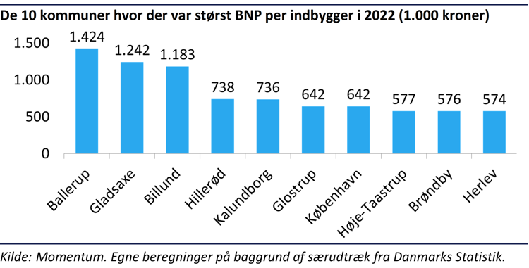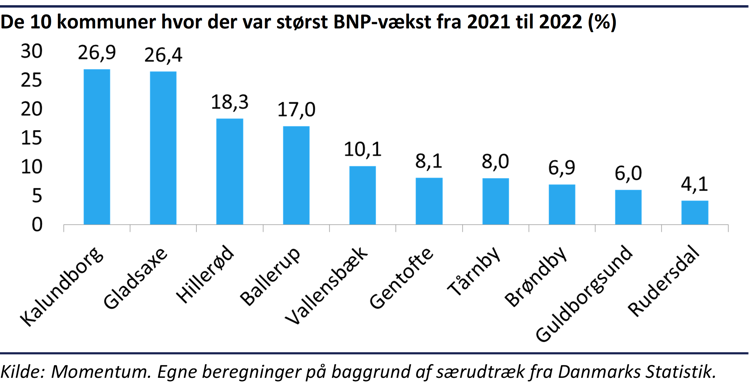 Helt i top på listen ligger Kalundborg, hvor produktionen steg med 26,9 procent i 2022, skarpt forfulgt af Gladsaxe, hvor BNP-væksten landede på 26,4 procent. Nummer tre og fire på listen er Hillerød og Ballerup kommuner, hvor BNP voksede med henholdsvis 18,3 og 17 procent. De fire ø-kommuner Fanø, Læsø, Samsø og Ærø er udeladt af analysen af diskretionshensyn.