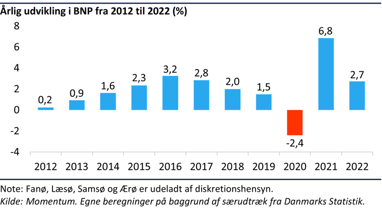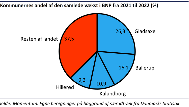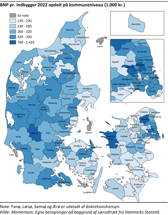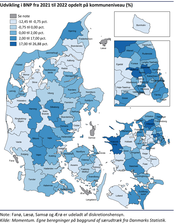 Ifølge Momentum-analysen ligger Herning, Billund, Vejle, Aarhus, Horsens, Silkeborg og Hjørring alle i top-20 målt på BNP-vækst i 2022, ligesom kommuner som Billund, Ikast-Brande, Aarhus, Ringkøbing-Skjern, Fredericia, Kolding, Aabenraa, Esbjerg og Sønderborg ligger i top-25 målt på BNP pr. indbygger.