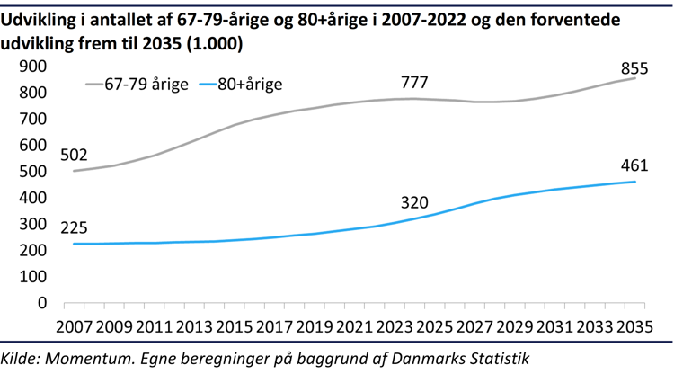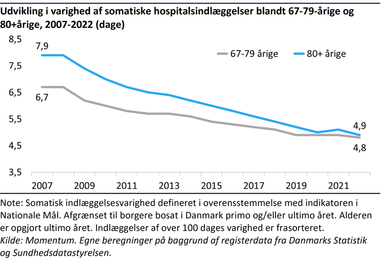 Dagene, hvor ældre lå i deres hospitalsseng og kom til hægterne, hører fortiden til. I stedet kommer mange på en af kommunernes midlertidige pladser, hvis de ikke er klar til at komme hjem. Det viser en ny Momentum-kortlægning, som blandt andet viser, at der siden strukturreformen i 2007 er sket et markant fald i den gennemsnitlige varighed af sygehusindlæggelser for ældre danskere. I 2007 lå de 80+-årige danskere knap otte dage i en hospitalsseng, før de blev udskrevet. I 2022 var tallet faldet til knap fem dage. Et fald på hele 38 procent. Og også så blandt de 67 til 79-årige er der sket et fald. Fra 6,7 dage i 2007 til 4,8 dage i 2022.