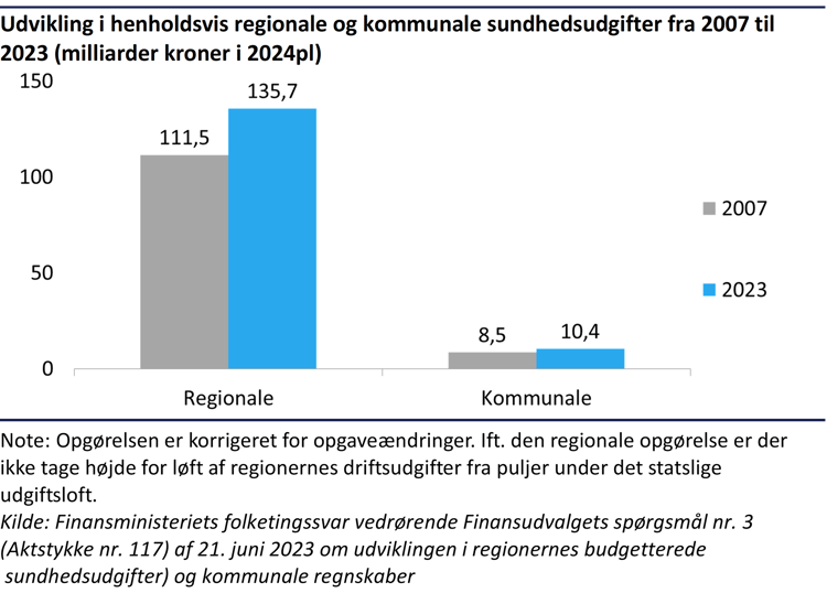 Det store fokus på sygehusene og den højt specialiserede behandling skinner igennem i udgiftsudviklingen på sundhedsområdet. Siden 2007 og frem til 2023 er udgifterne til det regionale sundhedsvæsen steget med mere end 24 milliarder kroner. I samme periode er de kommunale sundhedsudgifter blot steget med 1,9 milliarder kroner.