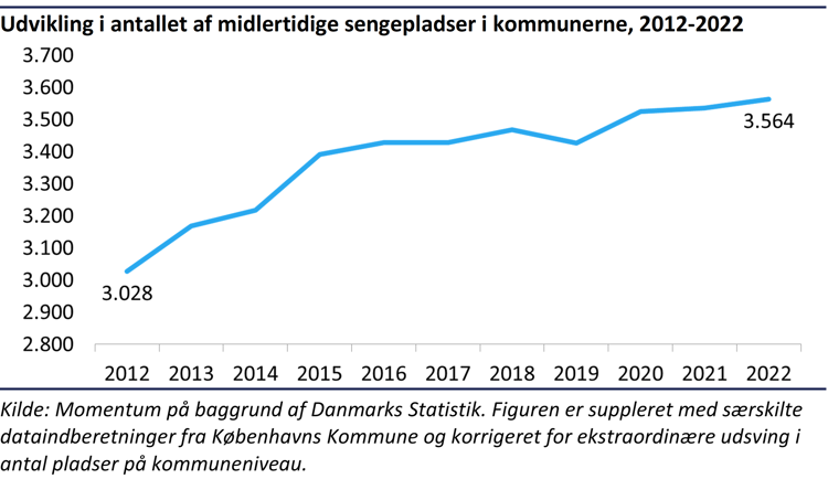I takt med den faldende indlæggelsestid er antallet af de kommunale midlertidige sengepladser steget. Mens der i 2012 var lige over 3.000 sengepladser, så var antallet i 2022 steget til mere end 3.500, der for størstedelens vedkommende er målrettet patienter, der er udskrevet fra et sygehus.