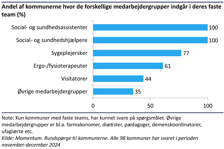 Momentums rundspørge viser, at de faste teams i mere end tre ud af fire kommuner med faste teams består af social- og sundhedsassistenter og -hjælpere og også sygeplejersker, ligesom faggrupper som ergoterapeuter og fysioterapeuter indgår mange steder.