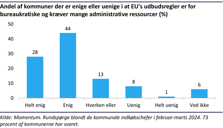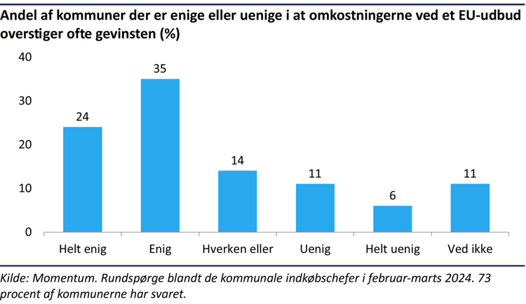 De kommunale indkøbschefers svar i Momentum-rundspørgen peger da også klart i retning af, at EU-udbuddene oftest er et stort ståhej for ingenting. 72 procent af indkøbscheferne svarer, at de er helt enige eller enige i, at udbudsreglerne er for bureaukratiske og kræver mange ressourcer, mens 59 procent mener, at omkostningerne ved EU-udbud ofte overstiger gevinsten.