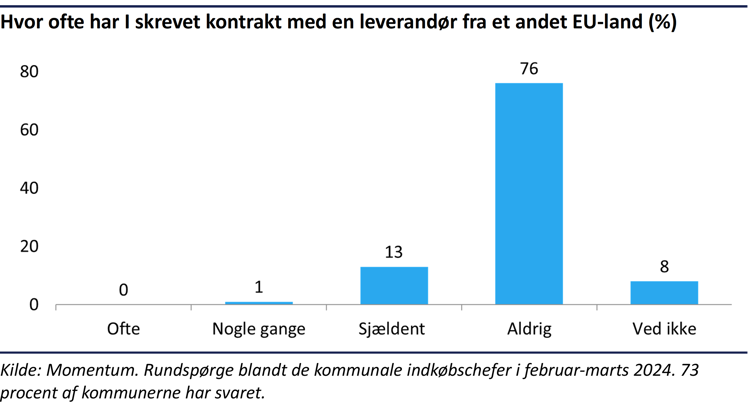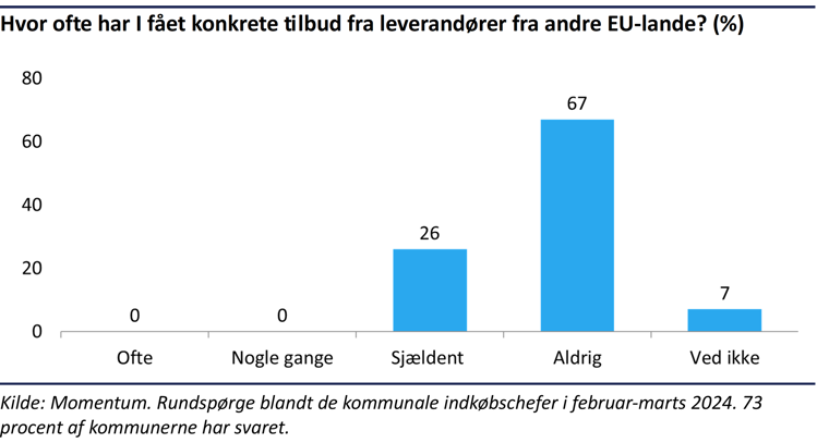 67 procent af de kommunale indkøbschefer svarer, at de aldrig har fået konkrete tilbud fra leverandører fra andre EU-lande, mens 26 procent svarer, at det sker sjældent. Ingen af respondenterne svarer, at de ofte eller nogle gange får konkrete tilbud fra virksomheder fra andre EU-lande.