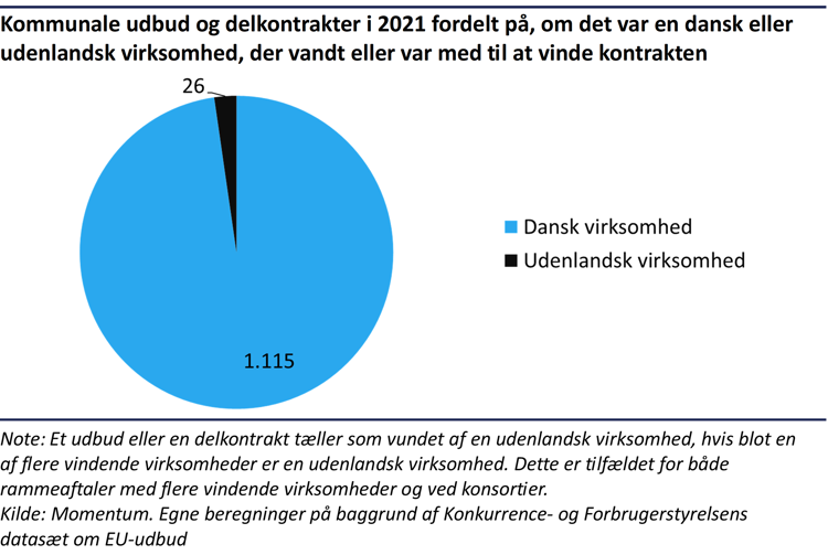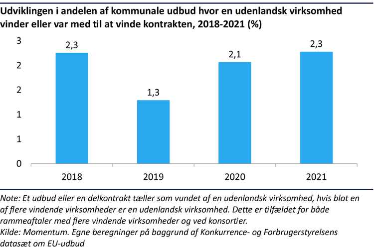 Fra 2018 til 2021, som er de seneste data om EU-udbud, har udenlandske virksomheder kun vundet godt 2 procent af de kommunale udbud. I 2019 skrabede andelen bunden, hvor kun 1,3 procent af de kommunale EU-udbud blev vundet af en udenlandsk byder. I 2021 toppede andelen. Her var det 2,3 procent af de 1.141 kommunale udbud, der blev vundet af en udenlandsk virksomhed.