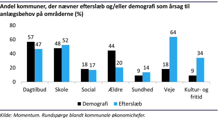 57 procent af økonomicheferne peger i rundspørgen på, at det på dagtilbudsområdet er demografien, der er årsag til anlægsbehovet. For skoleområdet er det 48 procent, mens det på ældreområdet er 44 procent.