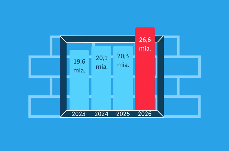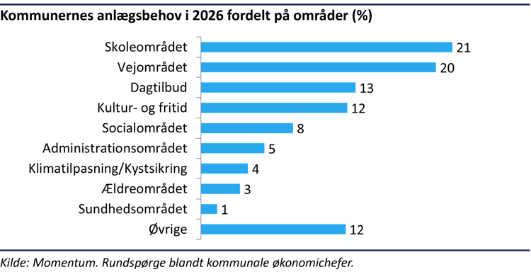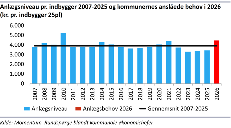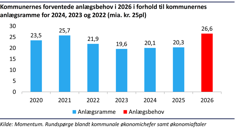 Kommunernes behov for at få bygget og renoveret deres bygninger og veje ligger ifølge en ny Momentum-rundspørge blandt landets kommunale økonomichefer langt højere end de seneste års anlægsrammer. Mere nøjagtigt anslår kommunerne, at de har behov for at bygge og renovere for 26,6 milliarder kroner i 2026, men kommunernes årlige forhandlinger med regeringen om kommunernes økonomi er de seneste år kun endt med en anlægsramme omkring de 20 milliarder kroner.