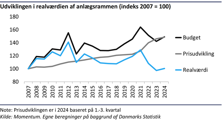De historisk lave anlægsrammer de seneste tre år er ifølge Kurt Houlberg, professor hos Det Nationale Forsknings- og Analysecenter for Velfærd (VIVE), forårsaget af en cocktail af omstændigheder: Høj inflation, der ikke levner plads til store offentlige investeringer, et anlægsbehov i regioner og staten, der også skal tilgodeses, og især i de seneste år også et behov for store investeringer i forsvaret.