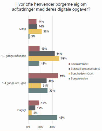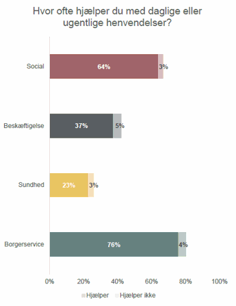 I undersøgelsen blev medarbejdere fra de fire fagområder bedt om at vurdere, hvorvidt og hvor meget de hjælper borgerne med forskellige typer af opgaver. Det varierer meget i de forskellige fagområder hvilken hjælp frontmedarbejderne yder, og dermed varierer også de udfordringer som medarbejderne oplever.