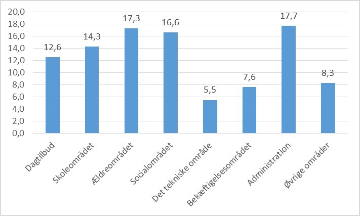Figuren nedenfor viser, at ingen områder er fredet, når der skal udvikles og implementeres effektiviseringspotentialer. Alle områder bidrager, men ligesom tidligere år, så er administrationsområdet fortsat det område, hvor kommunerne forventer at opnå største gevinster i 2018.