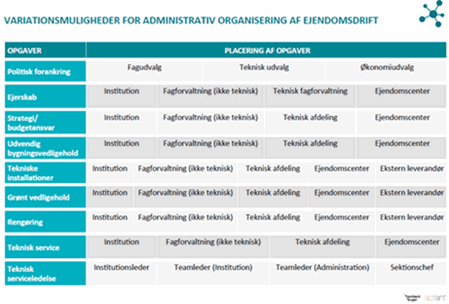 Billede 1: Organisering af ejendomsadministration. Modellen viser, hvordan kommuner kan placere deres ejendomsadministrative opgaver. Kilde: Actant 2018