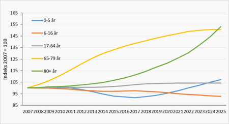 I år 2025 vil der alene være en tilgang på ca. 90.000 ældre over 80 år. Samtidig oplever mange kommuner i disse år et fald i antallet af skolebørn (6-16-årige) samt en stigning i antal 0-5-årige.