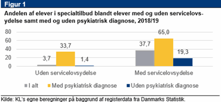 Blandt udsatte børn og unge, der har en psykiatrisk diagnose, er der en endnu højere segregeringsgrad - hele 65 pct. af disse børn går i et specialtilbud. Det er dobbelt så høj en andel sammenlignet med ikke-udsatte elever med en psykiatrisk diagnose, jf. figur 1.