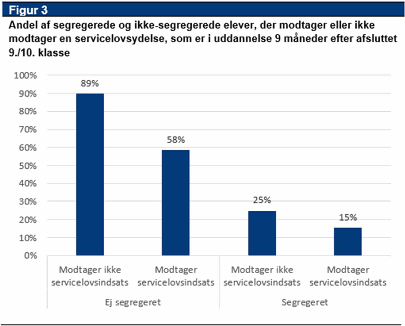 efter grundskolen, er det godt en fjerdedel af de elever, som alene er segregerede. Tallet er kun 15 pct. for de eleverne, der både er segregerede og også modtager en servicelovsydelse. Til sammenligning er det tal 89 pct. for elever, som hverken er segregerede eller modtager servicelovsydelser.