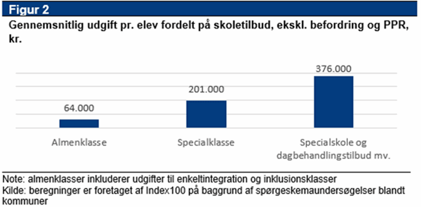 En elev i en almenklasse koster gennemsnitligt 64.000 kr. Til sammenligning koster elever på en specialskole/dagbehandlingstilbud mv. ca. 380.000 kr., og en plads i en specialklasse koster ca. 200.000 kr.
