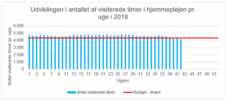 Rapporten viste, at en af udfordringerne opstod i visitationen af timer i hjemmeplejen, hvor der i 2018 indtil uge 39 konsekvent blev visiteret flere timer, end hvad der oprindeligt var budgetteret med, jf. figur 2.