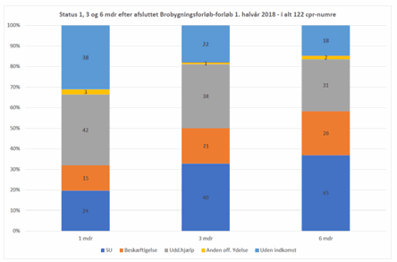 Kommunen har med DREAM-data analyseret effekterne af BTU ved at følge de borgere, der har afsluttet et brobygningsforløb 1, 3 og 6 måneder efter . Her viser data positive effekter med en markant voksende andel, der er under uddannelse eller i beskæftigelse. Dette kan kommunen bruge i sin opfølgning og prioritering.