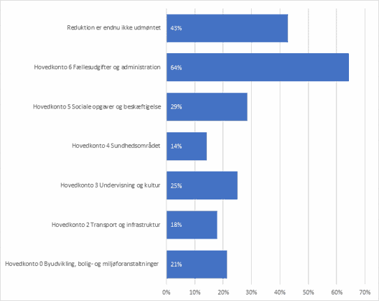 Udmøntningen af konsulentbesparelserne i budget 2021 sker i overvejende grad på det administrative område (jf. figur 3), men i en del kommuner er besparelserne udmøntet bredt i organisationen. Det kan indikere, at der også vil ske reduktioner af konsulentydelser på borgernære områder, hvor der i parentes bemærket også indgår en del lovbundne konsulentudgifter.
