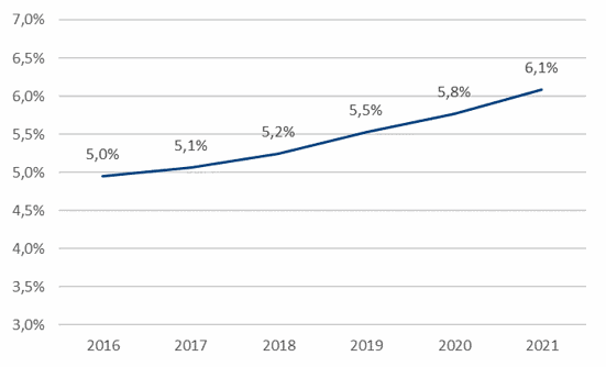 Kommunerne oplever, at en større andel elever i grundskolen har behov for specialundervisning. I perioden fra 2016 til 2021 er andelen af segregerede elever i de kommunale grundskoler steget fra 5,0 pct. i 2015 til 6,1 pct. i 2021 jf. figur 1. Stigningen er særligt markant i indskolingen, hvor andelen alene fra skoleåret 2015/2016 til 2018/2019 steg fra 3 pct. til 3.7 pct. [1.]