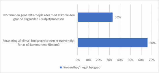KL’s kortlægning af kommunernes budgetproces viser, at 2 ud af 3 kommuner mener, at forankring af klima i budgetprocessen er i nogen grad, høj eller meget høj grad afgørende for at nå de kommunal klimamål jf. figur 1. Tilsvarende svarer kun ca. hver tredje, at de i nogen grad, høj grad eller meget høj grad arbejder med at koble den grønne dagsorden i budgetprocessen.