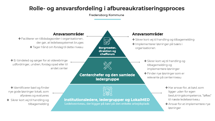 I Fredensborg Kommune er oplevelsen, at forskellige institutionsniveauer spiller forskellige roller for at komme overflødigt bureaukrati til livs. Afbureaukratiseringsprocessen er blevet opdelt på, hvad der vedrører hele organisationen, hvad der vedrører centeret, og hvad der vedrører den enkelte arbejdsplads, område eller institution. Forskellige aktører har fået forskellige ansvarsområder, hvilket beskrives i figur 2.