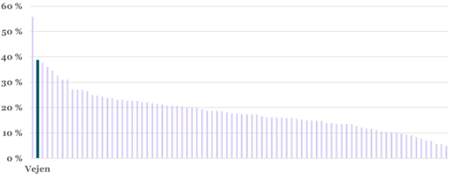 Her har man siden 2016 haft en strategisk beslutning om at satse på e-handel, og kommunen ligger i top-3 over e-handlende kommuner, når man ser på, hvor stor en andel af fakturaerne knyttet til det samlede varekøb, der e-handles. I 2022 har Vejen Kommune en e-handelsgrad på 38,6 pct. og er lykkes med at hæve e-handlen fra 2021 til 2022 med 6 pct. point.