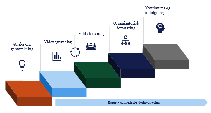 Det første trin handler om, at politikere og forvaltning har en fælles oplevelse af, at business as usual ikke længere fungerer hensigtsmæssigt. Dette har i flere tilfælde været udløst af et særligt udfordrende budgetår med et stort besparelseskrav, som er blevet hentet med brede rammebesparelser, der har kostet på den kvalitet, som kommunen kan levere til borgerne. Det var bl.a. tilfældet med Varde Kommune, som du kan læse mere om i dette nyhedsbrev: