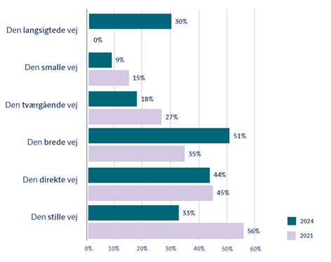 Her viser kortlægningen, at den brede vej i dag er den mest anvendte vej til råderum. Her svarer 51 pct. af kommunerne, at de anvender den brede vej, og det er dermed steget med 16 procentpoint, hvilket er den største stigning sammenlignet med 2021. I den anden ende er den mest populære vej i 2021, den stille vej, faldet med 23 procentpoint, og det udgør dermed det største fald siden 2021.