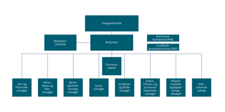 KL's bestyrelse bliver valgt på det første delegeretmøde efter et kommunalvalg. KL's formandskab består af KL's formand, næstformand og tre yderligere bestyrelsesmedlemmer. KL's repræsentantskab består af de 98 borgmestre og i denne valgperiode af yderligere 125 kommunalbestyrelsesmedlemmer.