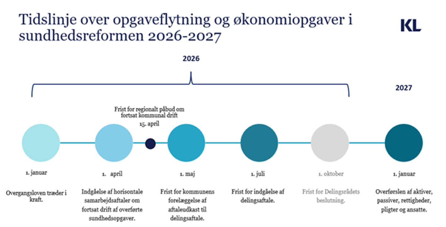 Sundhedsreformen medfører ændringer i kommunernes sundhedsopgaver og i den kommunale økonomi. Denne tidslinje giver et samlet overblik over de vigtigste datoer og processer frem mod – og efter – den 1. januar 2027, hvor myndighedsansvaret for fire udvalgte sundhedsopgaver overgår fra kommunerne til regionerne.